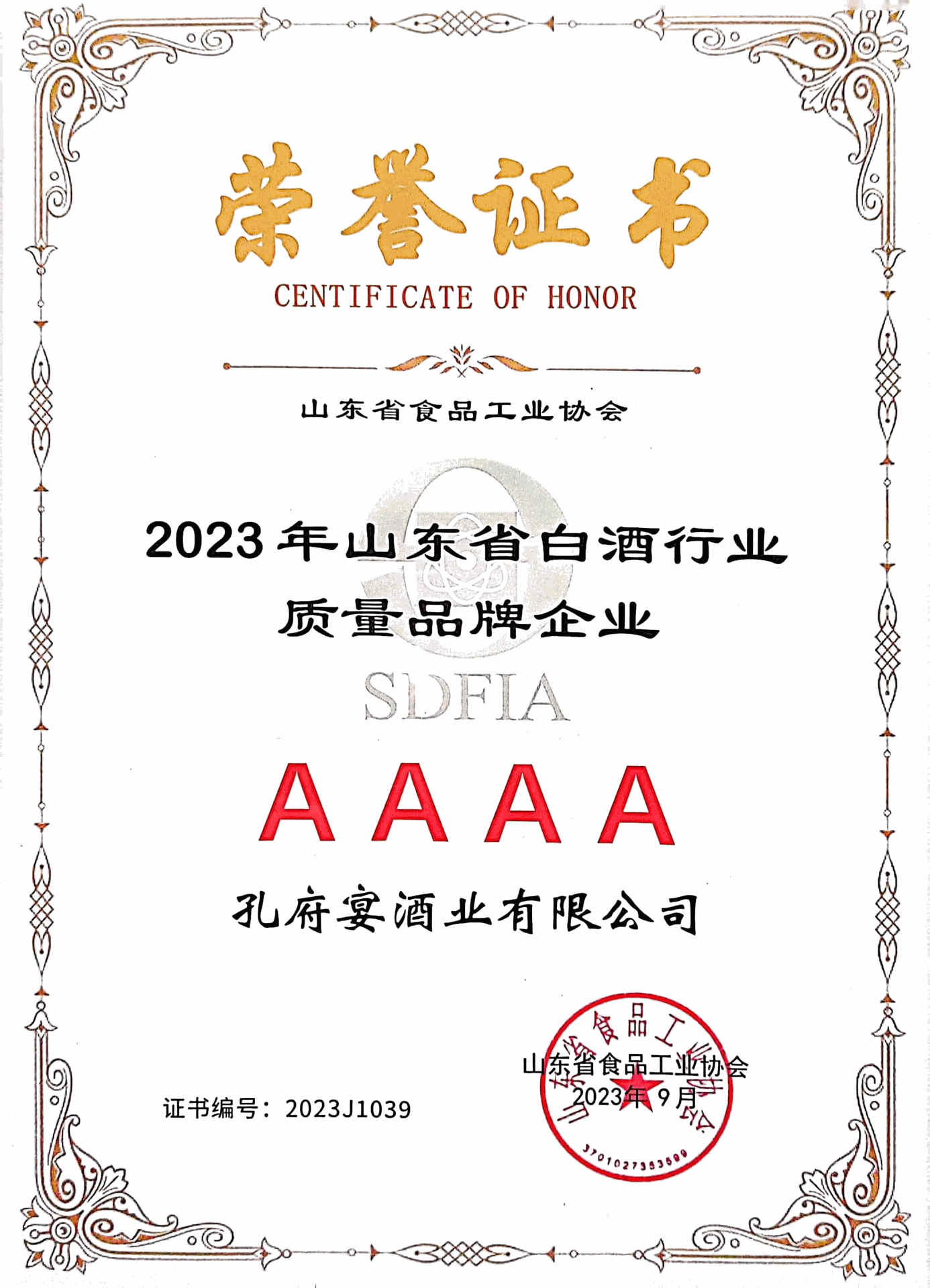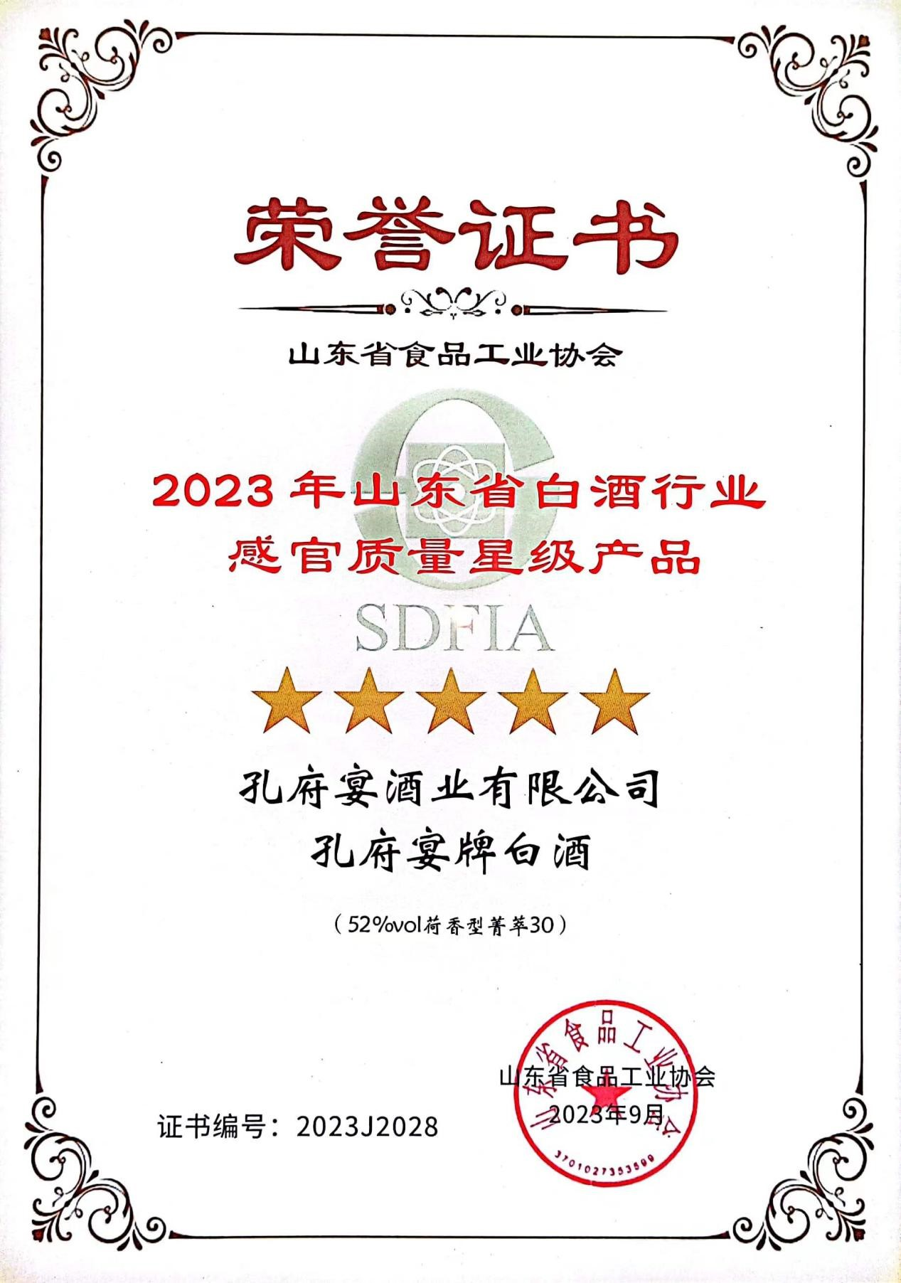 8月29-31日,在山东省食品工业协会举办的《2023年山东省食品工业协会行业评委年会暨行业食品感官质量评价会》上,孔府宴牌荷香型白酒“菁萃30”经国家评委、省评委的综合评审,被评为(酒类)2023年山东省食品行业感官质量五星级产品,孔府宴酒业同时荣获2023年山东省白酒行业质量品牌4A级企业。